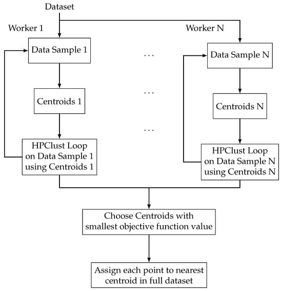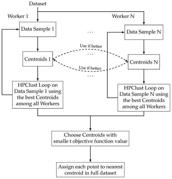 We propose HPClust, an array of parallel heuristic approaches for solving the MSSC-ITD problem via high-performance computing techniques. The algorithm’s main idea is to apply the problem decomposition technique, letting each parallel worker iteratively process a sequence of subproblems, and intelligently combine the obtained partial results into a single global clustering solution.