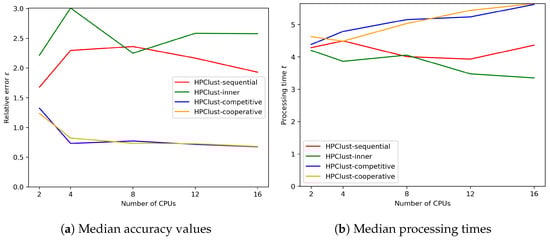 The results of the first set of preliminary experiments, illustrated in Figure 3a,b, determined the optimal number of CPUs for subsequent experiments, setting the stage for further investigation. As anticipated, the fully sequential strategy (HPClust-sequential) displayed no significant correlation with the number of parallel processors employed. The HPClust version with inner parallelism demonstrated a reduction in processing time with an increase in the number of CPUs, while the accuracy remained independent of the CPU count. In contrast, both the HPClust-competitive and HPClust-cooperative strategies exhibited an improvement in clustering accuracy as the number of CPUs increased. However, this accuracy gain came at the expense of increased processing time for these versions of HPClust. We attribute this observation to the need for coordination among multiple processors and the technical complexities introduced by Numba, such as parallel access to shared memory locations by multiple workers. Upon closer examination of the scores, we determined that utilizing 8 CPUs strikes the optimal balance between processing time and resulting accuracy across all algorithms on our machine. Thus, this choice of the CPU count was used in all the subsequent experiments.