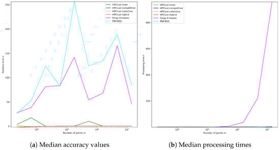 The scaling experiment results are presented in Figure 4a,b. For each x-axis value, the median score across 10 repetitions is displayed. The figures clearly show that all HPClust versions are highly robust and scalable with respect to the number of points, achieving optimal clustering accuracy (within of ground truth) while keeping clustering time under 3 seconds, regardless of dataset size. In contrast, competitive algorithms Forgy K-means and PBK-BDC exhibited substantially suboptimal clustering quality, with Forgy K-means incurring unacceptable linearly rising time costs with increasing points (e.g., over 2 h for a single execution on a 43 million point dataset). Meanwhile, PBK-BDC failed to provide steadily optimal clustering solutions at any data scale, despite slightly increased time costs for larger datasets. The HPClust versions demonstrated superior performance and scalability. The detailed experimental results, showcasing median values across various data scales and algorithms, are presented in Table 7 and Table 8 for a comprehensive understanding.