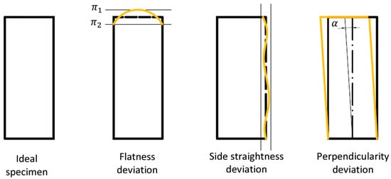 Related to geometrical deviations for both the specimen and the platens, three main parameters are highlighted by most standards: flatness deviation at both ends, side straightness of the lateral surface, and perpendicularity, measured by angle, as schematically depicted in Figure 1.