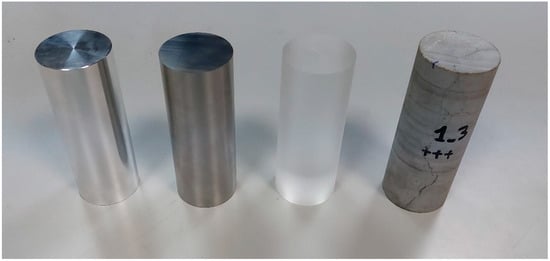 The mechanical properties of rock materials can substantially vary depending on their place of origin; therefore, a significant level of uncertainty may be introduced regarding the tolerance range of a particular specimen classified in accordance with UNE 22950-1:1990. Through comprehensive bibliographic research [1,79,80], adequate correlations can be established between steel, aluminum, and PMMA and the cases of high, medium, and low deformability, respectively. The selection of these three materials was based on their capacity to be accurately machined to guarantee the dimensional and geometric tolerances set by the standards. Additionally, a fourth limestone specimen was selected to extend the analysis to the behavior of rock materials subjected to the UCT. All specimens used are shown in Figure 3.