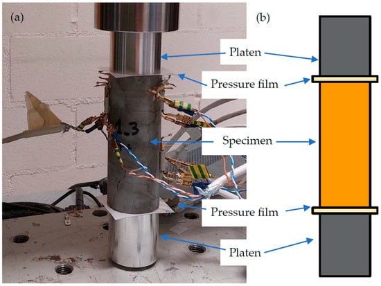 The test setup for all conducted compression tests is based on its standardized modality. In this regard, the specimen, as well as the testing frame, fulfil the recommendations suggested by the most relevant guidelines. It is worth noting that this affirmation also includes the spherical seat recommended by the standards. The sole modification introduced is the utilization of Fujifilm Prescale pressure films, which are placed in the interface between the specimen and the platens at both the top and bottom ends, as shown in Figure 4.