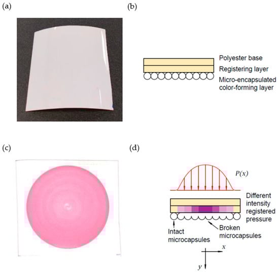 Detailed explanation regarding the pressure film used based on: (a) pressure films in their delivered condition, (b) schematic representation of their internal structure, (c) pressure film after test execution, and (d) schematic explanation of the coloring process, based on microcapsule technology.