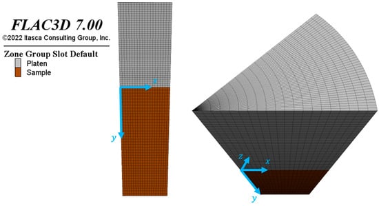 The modeling was performed using FLAC3D v. 7.0 software, developed by Itasca Group Consulting. This software employs the finite difference method. Consequently, the continuity of the numerical solution is ensured, which is mandatory due to the isotropic, homogeneous, and linear elastic characteristics assigned to the materials. This software possesses a solid background in the analysis of real engineering situations and laboratory testing [81,82,83,84,85,86].