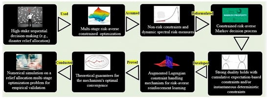 In certain sequential decision-making situations, e.g., disaster response or highly disruption-prone supply chains [1,2,3,4], decision outcomes are not only highly uncertain because of the gradual revelation of uncertainty, but their worst effects cannot be tolerated. To be robust against these worst-case outcomes, we need to use constraints to eliminate those decisions from the feasible solution space that may lead to them, while for additional robustness, we must use a dynamic risk-averse objective as a representation of decision makers’ risk-averseness (a behavioral consideration). In the literature, constraints are specifically used for robust decision-making, especially in the safe reinforcement learning domain [5,6,7], while the use of a risk-averse objective function is also prevalent for decision robustness [8,9,10,11,12]. Recently, the simultaneous use of constraints and risk aversion is also regarded as an effective approach for robust decision-making [1,13,14]. This leads us towards multi-stage risk-averse constrained optimization models. Studies have used stochastic dual dynamic programming (SDDP) for the solution of these kinds of models [9,15]. However, SDDP assumes the problem’s convexity and a finite number of random scenarios for its optimal convergence, which is restrictive as many real-world problems are non-convex, e.g., humanitarian relief allocation with deprivation costs [16], requiring multi-stage solution approaches which can handle non-convexities. Although [17] did not presume the problem’s convexity while using disciplined convex–concave programming for multi-stage risk-averse constrained optimization, optimal convergence was not established either theoretically or empirically. In this regard, as a model-free machine learning-based framework [18,19], reinforcement learning (RL) can be a better solution approach to non-convex problems. It has shown state-of-the-art performance in various real-world domains, e.g., cloud computing [20], finance [21,22], transportation [23,24], energy [25,26], inventory management [27,28], manufacturing or production scheduling [29], and routing [30]. However, in all of the above applications, robust and high-stack decision-making is not required, and thus expectation-based unconstrained RL is used. As we are considering high-stakes decision-making under uncertainty, risk-averse RL algorithms with constraint-handling abilities are required.