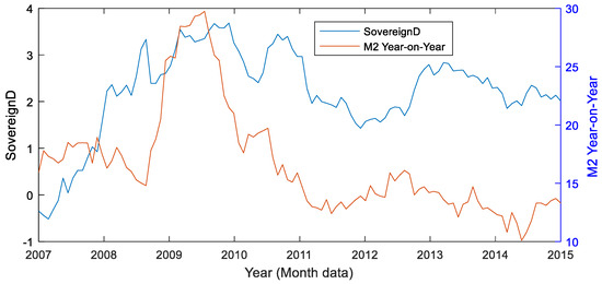Figure 1, Figure 2, Figure 3 and Figure 4 illustrate the relationships between the Federal Reserve’s unconventional monetary policy and the key macroeconomic indicators in China. With the implementation of the unconventional monetary policy, the volatility in the spread between long-term and short-term U.S. Treasury yields exhibited a negative correlation with the growth rate of China’s real output from 2008M1 to 2009M11, and a positive correlation after 2009M12. In addition, the changes in U.S. Treasury bond yield spreads and Chinese M2, and the changes in China’s price levels, maintained a similar overall trend. The correlation between the implementation of the unconventional monetary policy in the United States and the exchange rate of the renminbi (RMB) against the U.S. dollar is not intuitive.