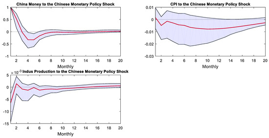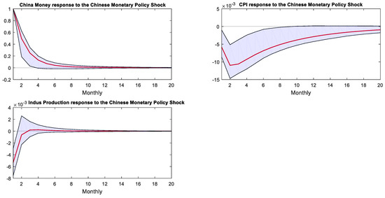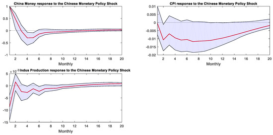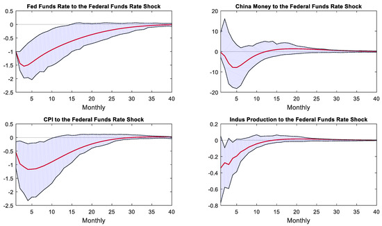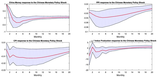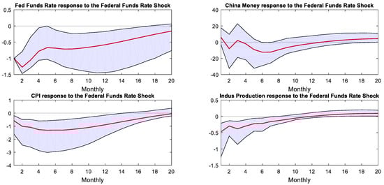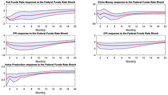 Figure 5 displays the IRFs of variables of the Chinese economy following a negative 1 percentage point response to U.S. monetary policy shock. Within the regime of the Fed’s QE monetary policy, China’s M2 growth rate increased by 5% after the shock, then rapidly declined, converging at nearly 20 months. However, it can be seen from the confidence interval that the M2 growth rate was significantly negative only from the fifth to seventh months after the shock. Chinese CPI significantly decreased by 0.6%, reaching its lowest point of −1.3% in the sixth month after the shock, then recovered and converged to zero after 20 months. Upon encountering a shock, China’s industrial value-added growth rate dropped by 0.5% and then gradually recovered. However, according to the confidence interval, it remained significantly negative for eight months following the shock.