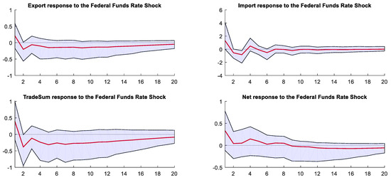 The United States is China’s most important trading partner, so we first considered the specification separately, augmented with monthly data about bilateral trade, including exports, imports, total trade volume, and net exports from China to the U.S. We present a sequence of SVAR calculations rather than a single one that includes all variables to avoid the problem of over-parameterization, according to [17]. Figure 7 shows the impulse response to the Fed’s unconventional monetary policy by bilateral trade channels between China and the United States.