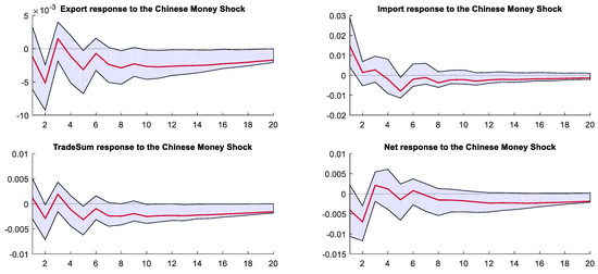 Figure 8 shows the dynamic response to China’s loose monetary policy shock. The growth rate of China’s exports to the United States significantly dropped to a negative value in the second month after the shock, then subsequently oscillated and converged slowly. On the other hand, the growth rate of China’s imports from the United States initially increased significantly upon the shock, followed by a rapid decline to the lowest point of −0.008% in the fifth month, then gradually converged to zero thereafter. The impulse response function of the total trade volume between China and the United States was similar to that of China’s exports to the United States. Furthermore, China’s net exports to the United States significantly dropped to a negative value in the second month after the shock, followed by a slow oscillation and convergence to zero.