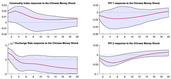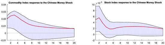 Figure 10 shows the impulse response to China’s loose monetary policy. As shown in the left panel, the global commodity futures market increased significantly by more than 0.02% and remained positive for nearly 5 months. Meanwhile, similar to the futures index, the Chinese stock market index significantly and continuously rose for 3 months after the shock. Hence, compared with the Fed’s unconventional monetary policy, the liquidity released by the PBOC’s policy pushed up the global commodity market significantly and persistently.