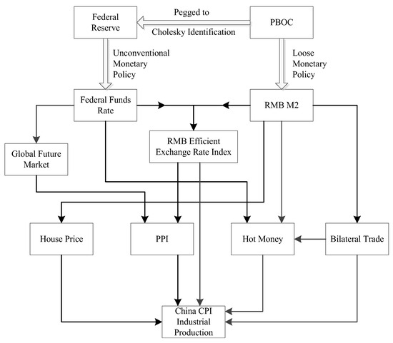 China’s net exports to the United States are an important component of the transmission channel for a spillover effect on the economy. Global commodity prices are a major feature of the transmission channel of inflation in China. Based on data from July 2008 to November 2013, the authors of [15] used a panel vector autoregression (PVAR) model with a proxy variable of the Fed’s QE monetary policy as the independent variable and the macroeconomic indicators of BRIC countries as the dependent variable to study the spillover effects of the Fed’s unconventional monetary policy on BRIC countries. The results showed that the QE policy pushed up outputs and price levels in the short run, promoting the appreciation of currencies of BRIC countries and increasing exports and stock market indices in these countries. The authors of [16] extracted nine sub-indicators of China’s financial system as a financial cycle indicator based on a theoretical small open economy model, then constructed an SVAR model using the indicator of China’s macroeconomy, the proxy variables of U.S. monetary policy, and China’s economic cycle to study the impact of the Fed’s monetary policy on China’s business and financial cycles from 2008 to 2017. The results show that different types of U.S. monetary policies have different spillover effects, and the fluctuations of the financial sector run ahead of macroeconomic fluctuations.