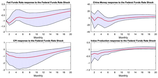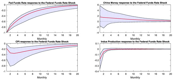 We estimated the benchmark VAR model using monthly data for the period 2008M1–2015M12, and Table A1 in the Appendix A shows the data sources. This period covers the beginning to the end of the Fed’s QE policy. The vector of observables, , includes four variables measured monthly: one is the federal fund rate as the U.S. monetary policy indicator as in [17], and three are Chinese variables, the M2 year-on-year growth rate and year-on-year changes in industrial production and the consumer price index. For the multiple targets of China’s monetary policy framework described in [23], we could not choose a single domestic interest rate as the monetary policy indicator, so, according to [24], the growth rate of M2 was set as the Chinese monetary policy indicator. The CBOE volatility index (VIX) is a real-time index that represents the market’s expectation of the relative strength of near-time price changes in the S&P 500 index, so the VIX was set as the exogenous variable, making the model a VARX model [25]. Based on the results of the Akaike information criterion (AIC), Bayesian information criterion (BIC), and Hannan–Quinn (HQ) information criterion, we used a VARX model with three lags. In addition, we also conducted stationarity and other relevant tests, as shown in Figure A1 and Table A2 and Table A3 in Appendix A. All VARX models in this paper passed the stationarity test (due to spatial constraints, the test results are not appended to the paper; interested parties may request them from the authors).