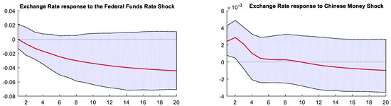 Figure 12 shows the IRFs of the exchange rate and the funds outstanding for foreign exchange in response to the U.S. loose monetary policy shock. The effective exchange rate index of the RMB initially rose, followed by a decline, but this was not significant. Meanwhile, foreign exchange deposits declined due to the shock, then rose again, became significantly positive after the fourth month, and gradually converged thereafter.