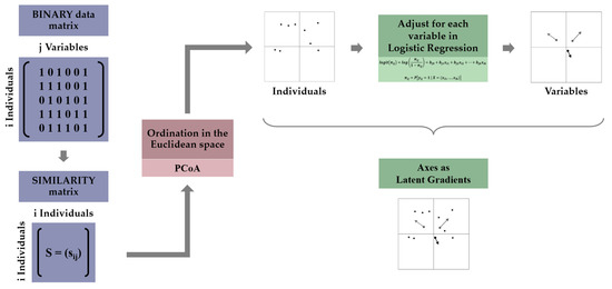 Figure 1) ordering the individuals in a low-dimensional Euclidean space, such that the distance between any two points approximates the dissimilarity between the individuals represented by these points as much as possible. To determine the coordinates of the variables associated with the ordering obtained in the PCoA, the directions that best predict the probability of presence for each variable are sought, and once obtained, the LB methodology [