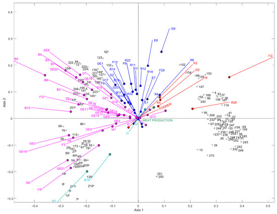 Figure 3 is obtained, which focuses on the most relevant and significant characteristics of the analysis. A close correlation is observed between the MEAT PRODUCTION variable and the variables related to extensive livestock infrastructure (I1, I2, and I3), as well as feeding strategies (G13) and genetics (GE2). These findings are consistent with farms of native or crossbred breeds that spend most of their life cycle in natural environments, making efficient use of available resources without depending significantly on human intervention for their survival.