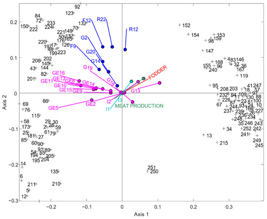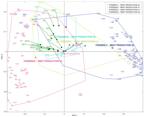 20]. The projection of each point onto each vector allows for obtaining the estimated probability of the presence of livestock characteristics in cattle farming [