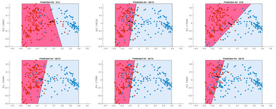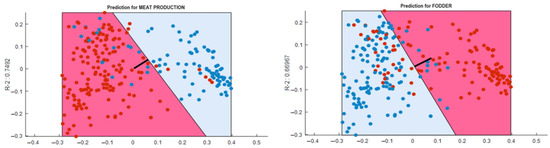 Figure 4), in those considered within the dimensions of feeding strategies (G13, G18) and genetics (GE10, GE14, GE15, GE16), it was observed that the number of erroneous predictions was low, especially in the variables G13, GE10, and GE14. Regions predicting presence are colored in red and regions predicting absence in blue, and dots with the same color as the region indicate that the corresponding livestock was correctly classified, according to the prediction of the external logistic model.