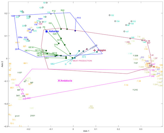 After carrying out the preliminary analysis detailed in the methodology, an initial representation is made only with the variables that have demonstrated statistical significance and goodness of fit greater than 25%. Given the number of variables involved in the study, the description of the results has been focused on the first dimension identified, which is the zootechnical characterization. It was observed that among the variables that define the different types of livestock farms, those related to the production of meat or suckler cows (MEAT PRODUCTION) and those destined for fattening the animal (FODDER) emerged as the most significant among the 252 Spanish beef cattle farms examined.
