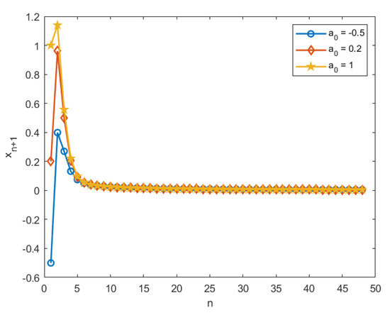 All codes were written in MATLAB 2018b, for the following different initial values: , , and . The sequence , which is a fixed point of . That is, the solution of problem (9), , exists. In this regard, a computational table (Table 1) and convergence graph (Figure 1) are shown below.