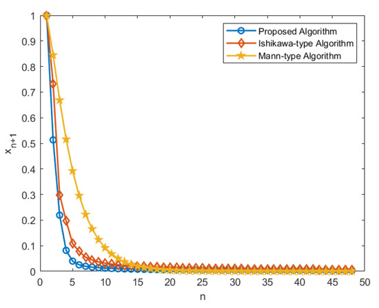 When the stopping criterion is achieved, the iteration methods will cease. Table 2 and Figure 2 compare Algorithm 1 with the Ishikawa-type algorithm (32) and the Mann-type algorithm (33), all initiated with the initial value