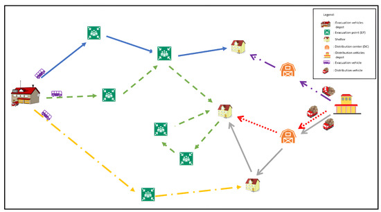 As previously mentioned, coordinating relief vehicles during natural disasters poses significant challenges. Comprehensive information on the number and locations of evacuees, availability of supplies and vehicles, capacities of vehicles, and distribution centers’ (DCs) and shelters’ locations must be meticulously managed. Therefore, efficient plans are essential for planning safe evacuations and effective relief distribution.