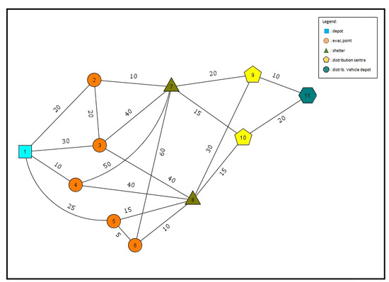 We have generated several synthetic datasets with different numbers of EPs, shelters, and DCs. The traveling time and network detail for one of the datasets are presented in Figure 3. In this figure, there are 11 nodes. Node 1 represents the evacuation vehicle depot, where eight identical vehicles, each with a capacity of 20 people, are available. Six evacuation points, , have a demand of , respectively. The temporary shelters with a capacity of 60 people are located at nodes and . It is assumed that it will take 10 min to load and unload evacuees at a shelter, respectively. There are two predetermined DCs ( and ) with a capacity of and a service time of 10 min. Four identical distribution vehicles with a capacity of 50 are available at the distribution vehicle depot (node 11). It is assumed that the flood will hit the predicted area within 2-h. The distribution of relief packages will start 1-h after the start of the evacuation. We assume that the completion time for each distribution vehicle is 150 min.