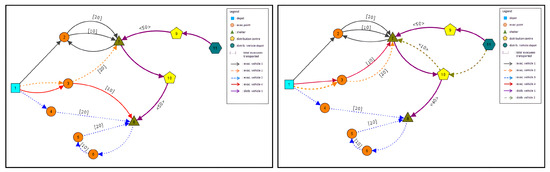 Evacuation and relief distribution plans of the integrated (left) and hierarchical (right) models.