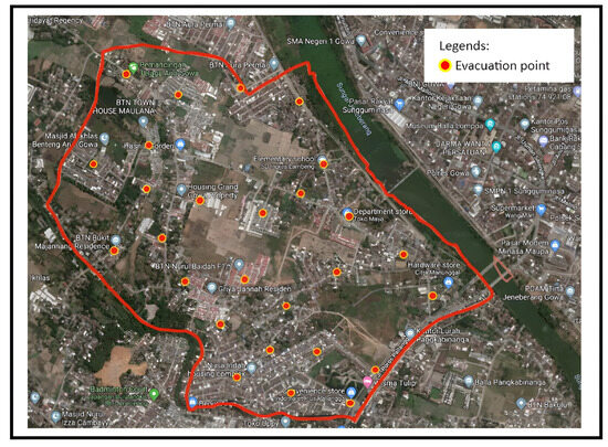 According to data from the Indonesia Bureau of Statistics and the National Disaster Management Agency (https://bnpb.go.id (accessed on 6 May 2021)), we estimated the demand at each evacuation point (Figure 5) and their respective closing time windows (in minutes).