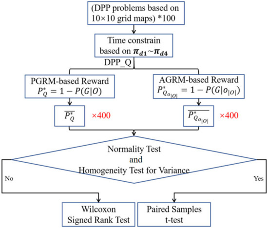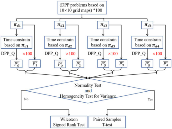 We conducted research on DPP problems under specific time constraints to test the performance of DPP_Q. The experimental design is illustrated in Figure 2. The process of DPP_Q experiments. Initially, the time constraint was computed according to the baseline methods based on which the observed was trained by PGRM-based DPP_Q. We aim to compare the average deceptiveness of paths generated by PGRM-based DPP_Q with those generated by , and it is meaningful when the time constraints are the same. The time constraint can be arbitrary for DPP_Q but not for . We decide whether to conduct Paired T-tests or Wilcoxon Signed Rank Tests according to the results of Normality Tests and Homogeneity of Variance Tests. After that, we further conducted a comprehensive analysis of the data, including measures such as means, medians, and other statistical parameters.