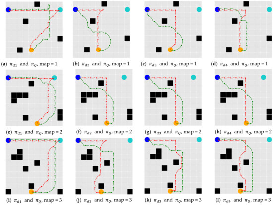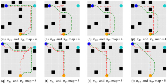 Figure 4 visualizes the paths generated by PGRM-based DPP_Q and on 10 × 10 grid maps numbered from 1 to 5 (i.e., a total of twenty DPP problems under specific time constraints), in which the green and red arrows represent the paths generated by DPP_Q and , respectively. And the word “map” represents the number of maps in Experiment 1.
