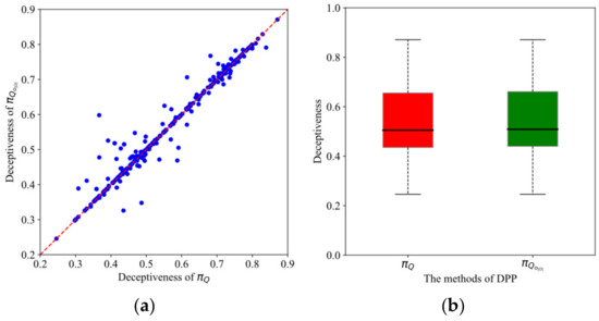 Figure 6a displays the comparison of the average deceptiveness of paths generated by PGRM-based DPP_Q (paths were donated as ) and AGRM-based DPP_Q (paths were donated as ), with the function as a reference. Every blue point represents a comparison between the two solutions to a DPP problem. Most of the points fall near the red dashed line. Figure 6b shows the box plot of the data in Figure 6a. Intuitively, the two sets of data are essentially the same.