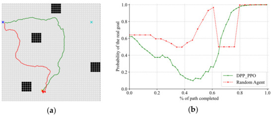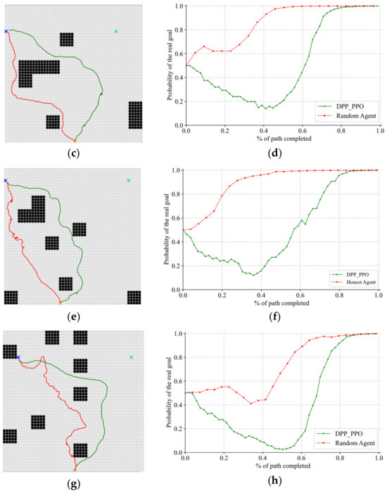 Figure 7a,c,e,g present the comparison results of DPP problems for maps numbered from 1 to 4 in Experiment 1, in which the blue cross represents the real goal, the teal cross represents the false goal, and the orange cross represents the start node. Green lines represent the deceptive path generated by DDP_PPO, while red lines represent that of the random one. Figure 7b,d,f,h, respectively, show the changes in the posterior probability of real goal on maps 1 to 4 as the completion of the paths varies. DPP_PPO significantly improves the average deceptiveness of paths.