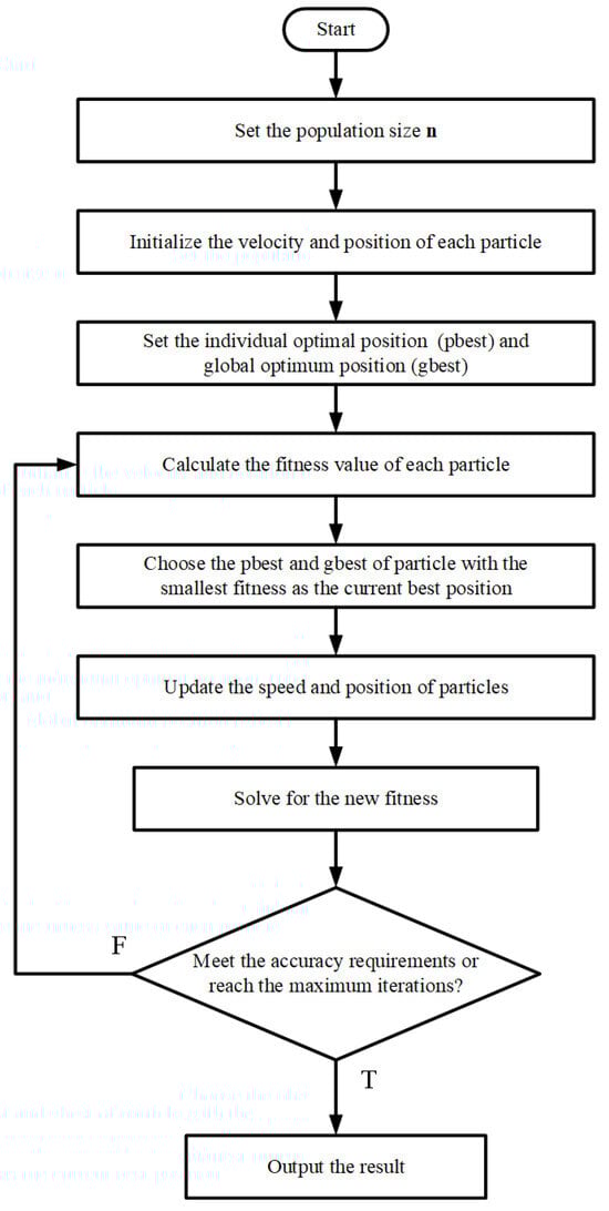where , ,, and represent the current iteration number, the maximum number of iterations, the minimum inertia weight, and the maximum inertia weight, respectively. The initial value of k is 0.6. Figure 1 shows the flow chart of the PSO algorithm.