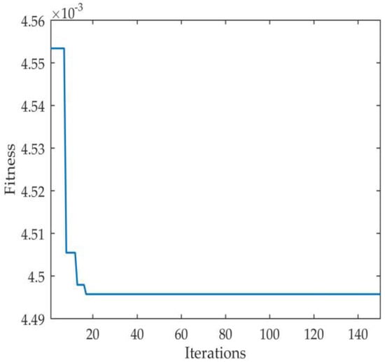 The PSO algorithm was used to optimize the penalty coefficient, C, and kernel function width, , in the SVR algorithm. The range of the two parameters was set to (0.1, 100) and (0.01, 10) [56]. The specific process is detailed in Section 2.3. The particles were iteratively adjusted based on their own experience and the experience of the optimal individual. The SVM regression model was trained with the training set data. After multiple iterations were converged, the optimal parameters C = 3.6261; = 0.1202 were finally obtained. The fitness value of the particle here was the mean square error between the predicted value and the actual value. The fitting curve is shown in Figure 3.