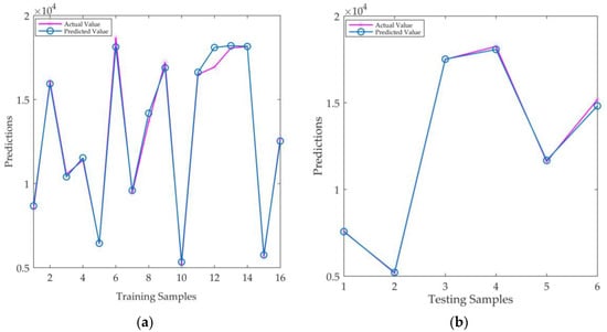 To better capture the features of the data set and thus accurately predict new data, the input parameters were C = 3.6261, = 0.1202, and then the trained SVR model was used for the test set prediction. The training and test sets were divided into data labeled 1 to 16 and 1 to 6, respectively. The sets were obtained with excellent fitting effects, while there were some errors in the training set, which indicates that the testing effect effectively removes noise and has better generalization. The model was used to predict the level of carbon emissions in China’s logistics industry, and the algorithm is specified in Section 2. The model training and testing graphs are shown in (a) and (b), respectively, in Figure 4.