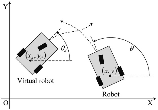 Note that the two-wheeled mobile robot can be classified as a differential flat system. Thus, we can choose the flat outputs , and the desired orientation, linear velocity, and angular velocity can be expressed as [30]