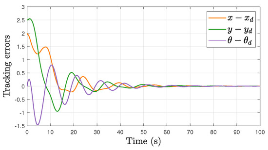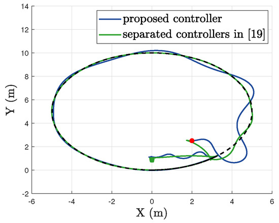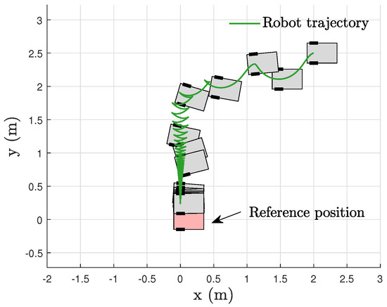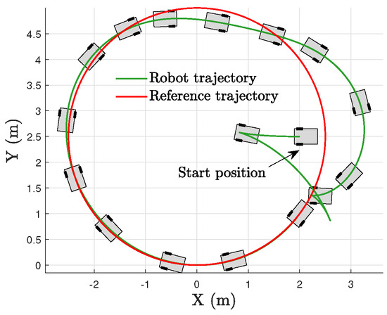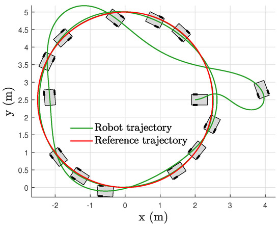 Note that the stabilization problem of the mobile robot belongs to case C1 in Assumption 3, while the tracking problem belongs to case C2. Similar conditions can also be found in [16,17]. The importance of this property includes the requirement of only one unified controller, and as there is no switching, there is an improved transient performance compared with the use of separate stabilization and tracking control strategies [19,20,23]. Furthermore, separate stabilization and tracking control approaches will not work if the switching time is not available.