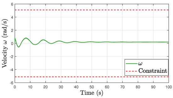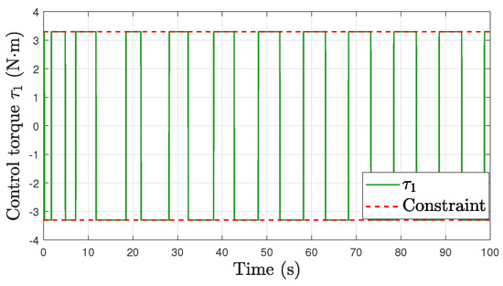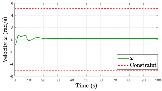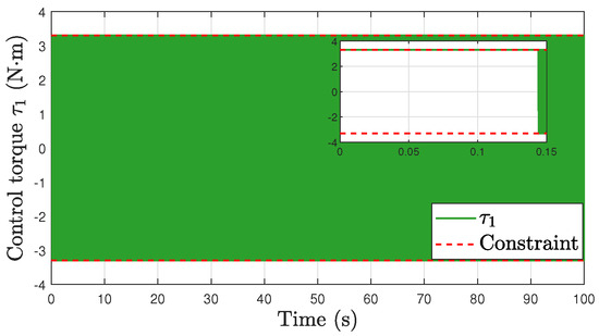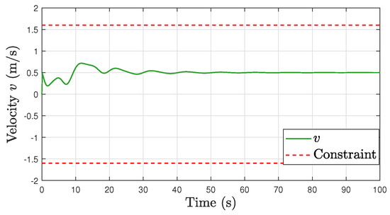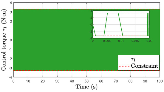 Stabilization Task. Based on Assumption 3, we set m/s and rad/s. The simulation results are shown in Figure 7, Figure 8, Figure 9, Figure 10 and Figure 11. Figure 7 illustrates the behavior of the robot’s position and orientation over time. The graph clearly shows that both the position and orientation of the robot asymptotically converge to their respective reference values. Figure 8, Figure 9, Figure 10 and Figure 11 provide a comprehensive view of the trajectories for the robot’s linear velocity v, angular velocity , and the torques and required for movement. The constraints imposed on these variables are visually represented by red dashed lines in their graphs. These constraints are defined as and . The plots clearly show that at no point on the trajectories of v, , , or exceed these prescribed limits. This observation confirms the effectiveness of our proposed method.