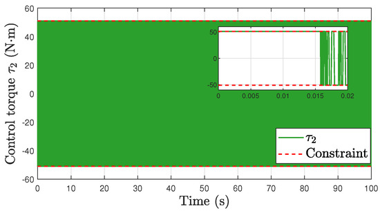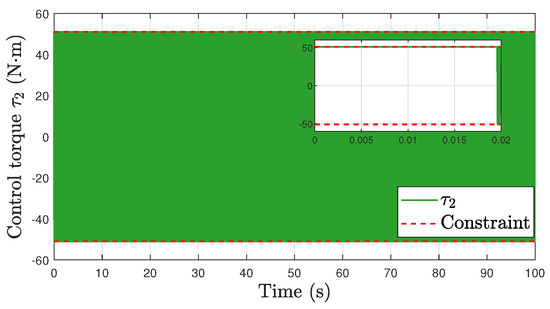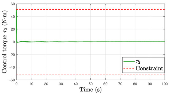 where and are small positive constants. These modifications still ensure the satisfaction of the velocity and torque constraints. The stabilization and tracking errors do not achieve asymptotic convergence, but rather converge to a residual set, the size of which may depend on the adjustable parameters and (a rigorous proof necessitates further investigation). This aspect is not the focus of this work. The simulation results of the tracking task are shown in Figure 12, Figure 13 and Figure 14 to illustrate this situation; all control parameters are the same as in the tracking task, except that (19) with and is applied.