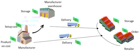 This study investigates a two-echelon SC in which several retailers buy their required product(s) from a single supplier. Thus, a coalition forms between the supplier and buyers who determine the size of shipments and number of times the production process is initiated per cycle as a collective decision, with the delivery method chosen to be discrete. The production process and delivery of the orders are started by the manufacturer at the same time. The manufacturer stores the surplus items in its own warehouse so that when the production process has finished and the retailers place new orders, the demands can be satisfied through the warehouse inventory. In this arrangement, the buyers have to pay for both the order placement and the storage of their purchased product in the manufacturer’s facilities. The costs of setting up, manufacturing, storing, and delivering the orders are paid by the supplier. The manufacturer can directly deliver the item(s) ordered by the buyer. Figure 1 illustrates the structure of the proposed single-manufacturer multi-retailer SC as follows.