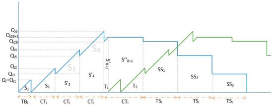 In Figure 4, the blue lines represent the manufacturer’s first product and the green lines represent the next product. In S2, up to Q2 products are manufactured and as many as products are delivered to the retailer. The same condition is true for as well. First, the manufacturer’s costs were obtained by calculating the AUC: