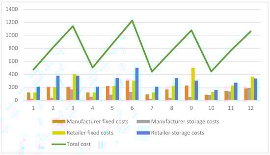 It can be observed that increasing the manufacturer’s storage costs leads to an increase in the total cost and has a slight effect on the number of production start-ups. The reason for this is the manufacturer’s decision to process smaller batches with the purpose of lowering the costs. The effects of reducing the cost of each instance of production are detailed in scenarios 7, 8, and 9.