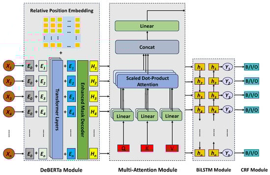 In this paper, we propose a new entity recognition model called DABC, which aims to enhance the accuracy and robustness of Chinese entity recognition. The model is based on BERT-BiLSTM-CRF, with the introduction of the DeBERTa model. Addressing the issue of insufficient refinement in the BERT model’s feature extraction process, a multi-attention mechanism is incorporated into the DeBERTa-BiLSTM-CRF model to enhance the model’s focus on key information. The proposed model framework is depicted in Figure 2.