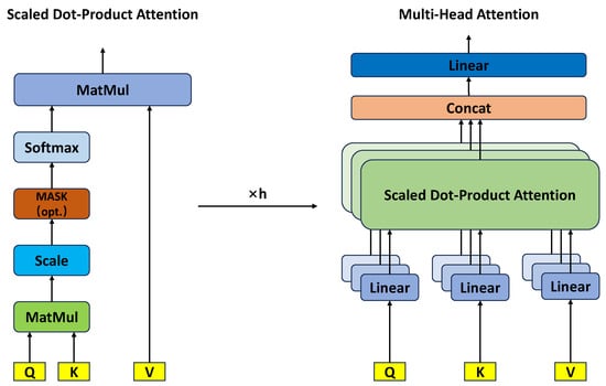 The concept of attention was first introduced by Dzmitry Bahdanau et al. [39]. Subsequently, the paper “Attention Is All You Need” by Ashish Vaswani et al. [40] elevated the attention mechanism to a new level. In the standard attention mechanism, a weighted context vector is computed to represent the information in the input sequence. In contrast, in multi-head attention, multiple sets of attention weights are used, each of which learns different information and produces a context vector. Finally, these context vectors are concatenated together, followed by a linear transformation to obtain the final output. The framework is illustrated in Figure 3.