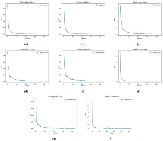 Training loss curves; (a) BERT-BiLSTM-CRF training loss curve; (b) DeBERTa-BiLSTM-CRF training loss curve; (c) BERT-Attention-BiLSTM-CRF training loss curve; (d) DeBERTa-BiLSTM-Attention-CRF training loss curve; (e) DebERTa-Self Attention-BiLSTM-CRF training loss curve; (f) DABC training loss curve; (g) RoBERTa-BiLSTM-CRF training loss curve; (h) XLNET training loss curve.