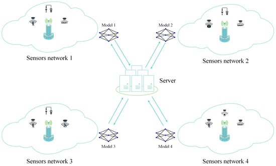 FL possesses considerable potential for application in intelligent sensor networks. As depicted in Figure 1, these networks generally comprise sensor nodes dispersed across multiple locations. These nodes collect and process environmental and privacy data. In traditional centralized learning methods, data are sent to a central server for training, which can raise privacy and security concerns, especially when sensor nodes handle sensitive information [12]. FL offers a decentralized approach that allows for model training while protecting data privacy. In intelligent sensor networks, FL provides advantages such as high security, privacy protection, and low communication overhead.