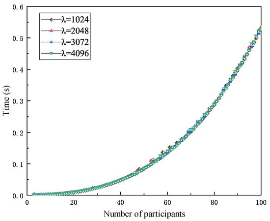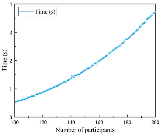 In Figure 4, as the number of participants gradually increases from 3 to 100, it can be observed that the solution time continuously increases, yet the total time taken does not exceed 0.55 s. Subsequently, when the security parameter was increased from 1024 to 4096, it is evident that the four curves essentially overlap, indicating that the increase in security parameters has almost no effect on the solution time.