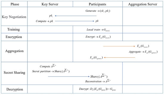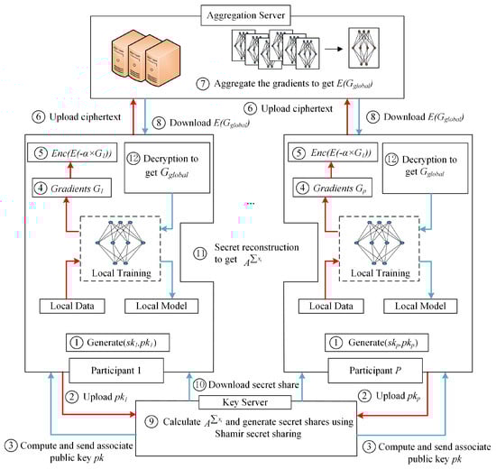 Before implementing encryption, each participant needs to generate the associated key. The specific process is as follows: Each participant will first generate and then send to the key server. The key server calculates y and then sends it to each participant. Each participant can then use the associated public key to perform HE. After downloading the aggregated ciphertext information, each participant needs to obtain the decryption key through the SS. Finally, more than 80% of the participants obtain the associated private key x through secret reconstruction and can use Equation (12) to complete the decryption. In this scheme, the specific method of combining homomorphic encryption and secret sharing is shown in Figure 6.