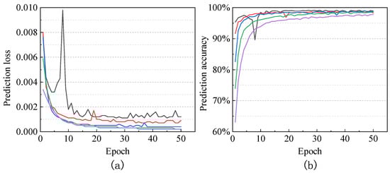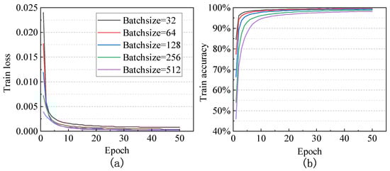Figure 7 and Figure 8 mainly demonstrate the changes in training loss, training accuracy, prediction loss, and prediction accuracy with epochs under different batch sizes in the testing process of the MNIST dataset. Figure 7a and Figure 8a show that with increasing of batch size, the initial loss in both the training and testing processes decreases significantly, but the final training loss decreases only slightly. In the testing process, when the batch size is small, the initial test loss fluctuates greatly and gradually stabilizes with increasing epochs. Figure 7b and Figure 8b show that with the increasing batch size, the initial accuracy of training decreases significantly, but the final training accuracy decreases only minimally. Similarly, when the batch size is small, the testing accuracy fluctuates. Since the performance results on the SVHN and CIFAR-10 datasets are similar to those on the MNIST dataset, they are not repeated here. As the batch size increases, the model’s convergence speed accelerates, allowing the training to achieve the desired effect in fewer training cycles. Therefore, under appropriate batch size conditions, it is possible to speed up model convergence, reduce training cycles, and thus lower the overall system’s computational overhead and communication volume, enhancing the system’s practicality.