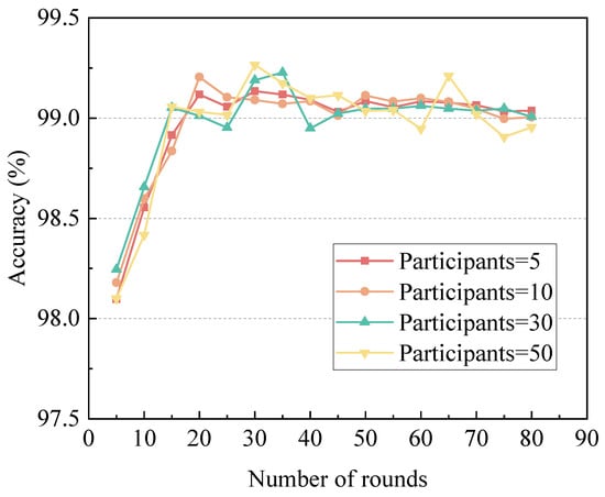 Figure 9 illustrates the variation in precision across training rounds with varying numbers of participants. As the number of participants increases, the final precision asymptotically approaches 99%, exhibiting only minor fluctuations throughout the training process. This suggests that variations in the number of participants have a negligible impact on the ultimate accuracy of the training.